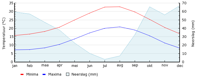 | Gem. max. temperatuur in °C | 15.7 | 16.5 | 18.1 | 20.7 | 24.9 | 29.0 | 32.6 | 32.7 | 29.7 | 25.2 | 20.5 | 16.7 |