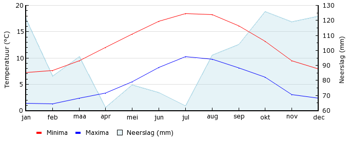 | Gem. min. temperatuur in °C | 1.4 | 1.3 | 2.3 | 3.3 | 5.5 | 8.2 | 10.2 | 9.8 | 8.1 | 6.3 | 3.0 | 2.3 |