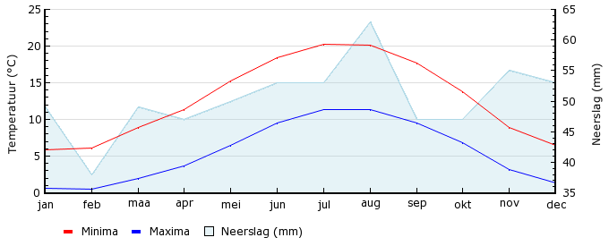 | Gem. max. temperatuur in °C | 5.8 | 6.1 | 8.9 | 11.4 | 15.2 | 18.4 | 20.3 | 20.1 | 17.7 | 13.8 | 8.9 | 6.5 |