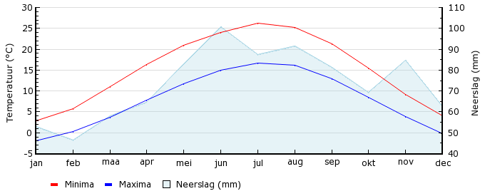 | Gem. min. temperatuur in °C | -2.0 | 0.3 | 3.7 | 7.8 | 11.8 | 14.9 | 16.6 | 16.2 | 13.0 | 8.5 | 3.8 | -0.3 |