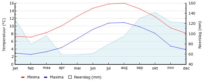 | Gem. max. temperatuur in °C | 7.3 | 7.1 | 8.3 | 10.1 | 12.6 | 14.7 | 15.8 | 16.0 | 14.5 | 12.5 | 9.5 | 8.1 |