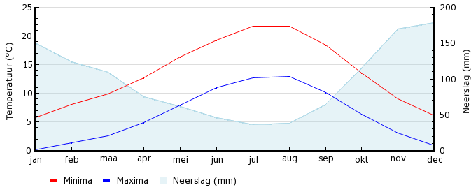 | Gem. max. temperatuur in °C | 5.7 | 8.0 | 9.9 | 12.7 | 16.3 | 19.3 | 21.7 | 21.7 | 18.4 | 13.5 | 9.0 | 6.1 |