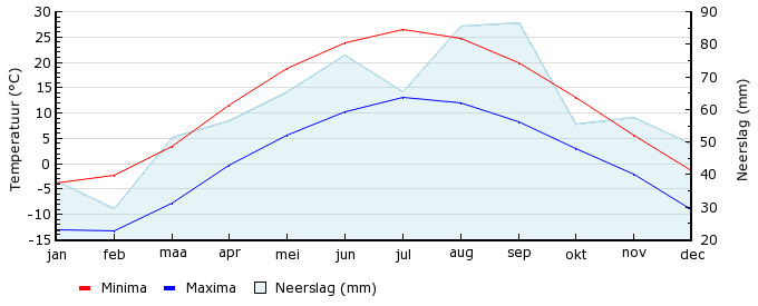 | Gem. max. temperatuur in °C | -3.7 | -2.2 | 3.4 | 11.5 | 18.9 | 23.8 | 26.4 | 24.7 | 19.9 | 13.2 | 5.6 | -1.4 |