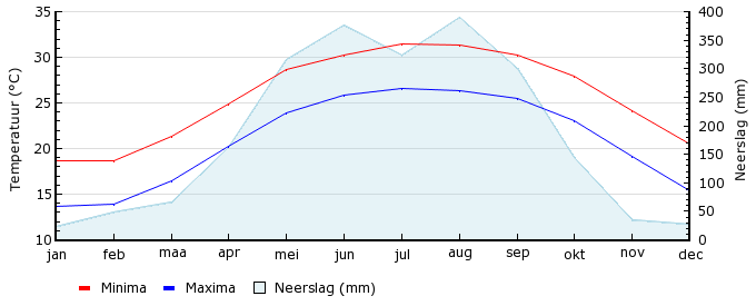 | Gem. max. temperatuur in °C | 18.6 | 18.6 | 21.3 | 24.9 | 28.7 | 30.3 | 31.5 | 31.3 | 30.3 | 27.9 | 24.2 | 20.5 |