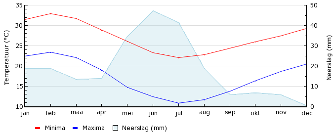 | Gem. max. temperatuur in °C | 31.5 | 32.9 | 31.7 | 28.9 | 26.1 | 23.3 | 22.1 | 22.8 | 24.4 | 26.0 | 27.4 | 29.3 |