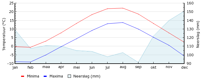 | Gem. min. temperatuur in °C | -8.9 | -9.1 | -5.0 | -0.2 | 4.3 | 9.2 | 13.1 | 13.7 | 10.0 | 5.2 | 0.6 | -5.8 |