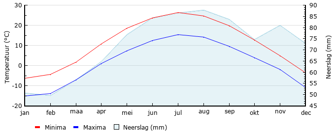 | Gem. max. temperatuur in °C | -6.4 | -4.5 | 1.8 | 10.8 | 18.6 | 23.6 | 26.4 | 24.7 | 19.7 | 12.8 | 4.8 | -3.6 |