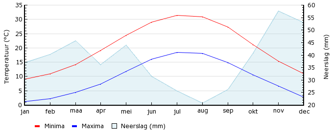 | Gem. max. temperatuur in °C | 9.1 | 11.0 | 14.2 | 19.2 | 24.5 | 29.1 | 31.4 | 30.9 | 27.3 | 21.2 | 15.4 | 10.9 |