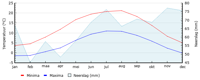 | Gem. min. temperatuur in °C | -1.5 | -1.4 | 0.5 | 2.5 | 6.3 | 9.3 | 10.9 | 10.8 | 8.7 | 5.9 | 2.3 | -0.2 |