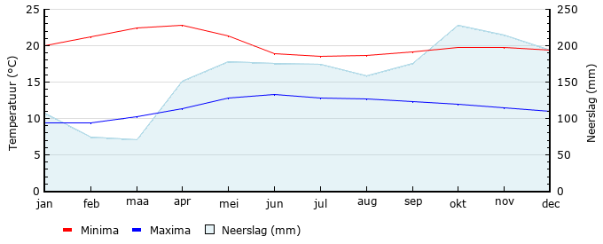 | Gem. max. temperatuur in °C | 20.0 | 21.2 | 22.5 | 22.8 | 21.3 | 18.9 | 18.5 | 18.7 | 19.2 | 19.8 | 19.8 | 19.4 |