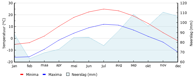 | Gem. max. temperatuur in °C | -5.1 | -3.6 | 2.0 | 10.3 | 17.7 | 22.4 | 25.0 | 23.5 | 19.0 | 12.6 | 4.9 | -2.3 |