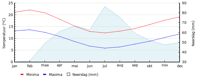 | Gem. min. temperatuur in °C | 13.2 | 13.6 | 12.6 | 10.8 | 8.7 | 6.7 | 5.9 | 6.4 | 7.6 | 8.8 | 10.4 | 11.8 |