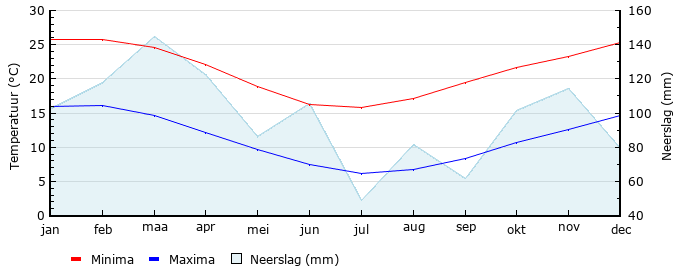 | Gem. max. temperatuur in °C | 25.7 | 25.7 | 24.6 | 22.1 | 18.9 | 16.2 | 15.8 | 17.1 | 19.4 | 21.6 | 23.2 | 25.3 |