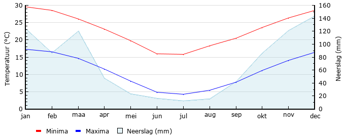 | Gem. min. temperatuur in °C | 17.3 | 16.6 | 14.7 | 11.6 | 8.1 | 4.8 | 4.3 | 5.4 | 7.7 | 11.1 | 14.0 | 16.4 |