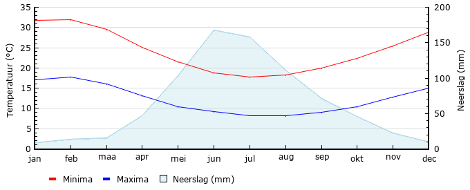 | Gem. max. temperatuur in °C | 31.7 | 31.9 | 29.5 | 25.1 | 21.5 | 18.7 | 17.7 | 18.2 | 20.0 | 22.3 | 25.5 | 28.9 |