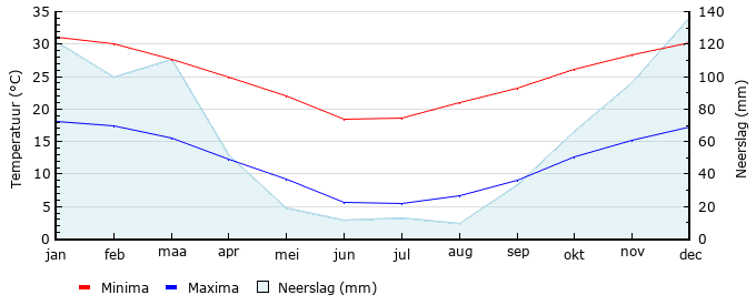 | Gem. min. temperatuur in °C | 18.1 | 17.4 | 15.6 | 12.3 | 9.3 | 5.7 | 5.5 | 6.7 | 9.1 | 12.6 | 15.2 | 17.3 |