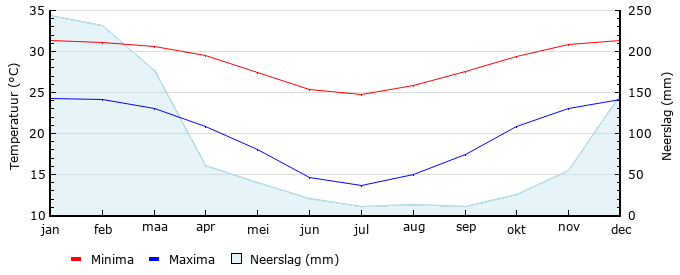 | Gem. min. temperatuur in °C | 24.3 | 24.1 | 23.0 | 20.8 | 18.0 | 14.6 | 13.6 | 15.0 | 17.5 | 20.8 | 23.1 | 24.1 |