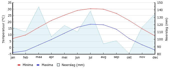 | Gem. max. temperatuur in °C | 7.1 | 9.9 | 15.6 | 21.1 | 25.2 | 29.0 | 30.4 | 30.0 | 26.7 | 21.1 | 14.7 | 9.1 |
