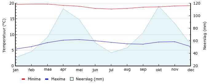 | Gem. max. temperatuur in °C | 19.6 | 19.7 | 19.7 | 19.3 | 19.0 | 18.3 | 18.1 | 18.3 | 18.7 | 18.8 | 19.1 | 19.2 |