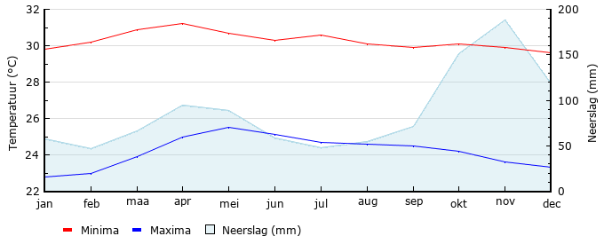 | Gem. min. temperatuur in °C | 22.8 | 23.0 | 23.9 | 25.0 | 25.5 | 25.1 | 24.7 | 24.6 | 24.5 | 24.2 | 23.6 | 23.3 |