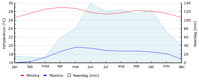 | Gem. max. temperatuur in °C | 26.6 | 27.6 | 28.6 | 29.0 | 28.8 | 27.8 | 27.4 | 27.7 | 28.3 | 28.1 | 27.6 | 26.6 |